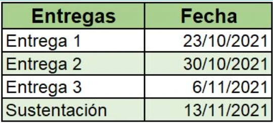 Fechas a tener en cuenta para entregar las diferentes actividades del Proyecto Final